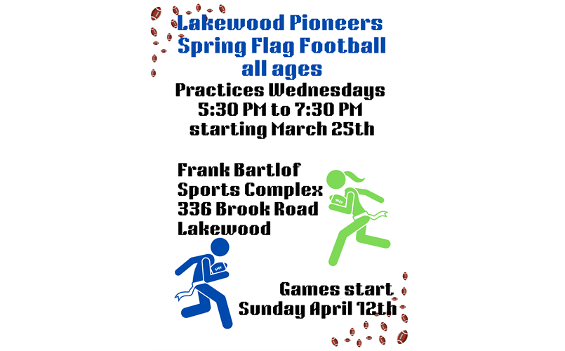 Spring Flag Football - ONLY $95Practice on Wednesdays 5:30-7:30 PM starting 3/25/26Games Sundays starting 4/5/26Frank Bartlof Sports Complex336 Brook Road Lakewood